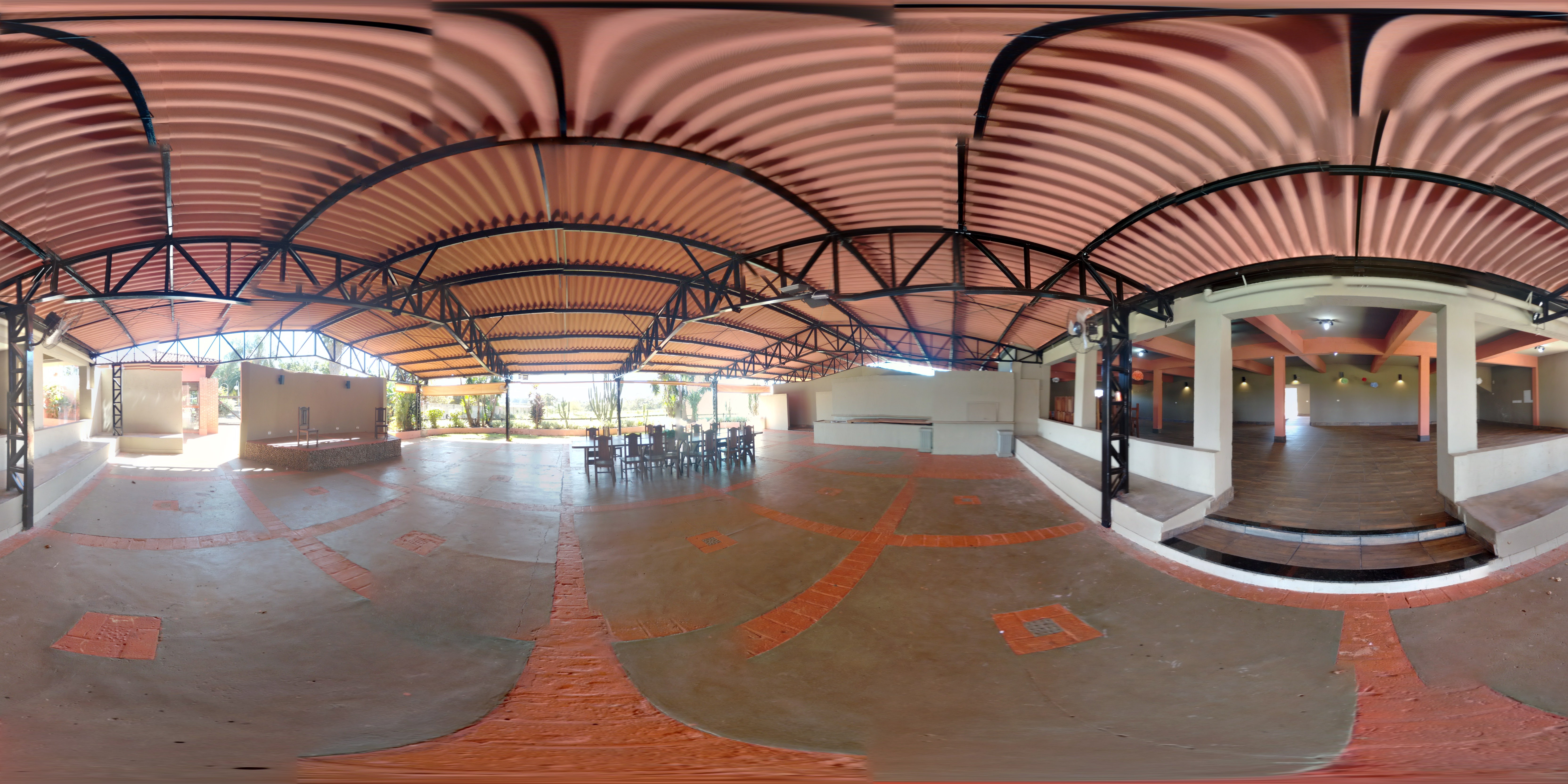Tour 360° A NOSRALLA espaço de eventos preparou dois passeios 360° para que você possa se sentir aqui. Seja paciente, aguarde alguns instantes para que carreguem as imagens 360°. Entrada do salão e Estacionamento. Vista do salão